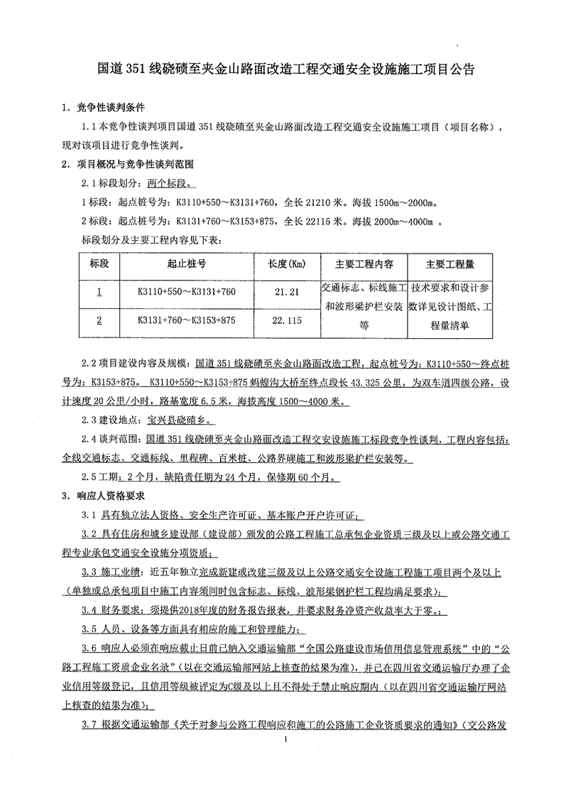 雅安交建集團路橋有限責任公司國道351線磽磧至夾金山段路面改造工程交通安全設施施工項目競爭性談判公告