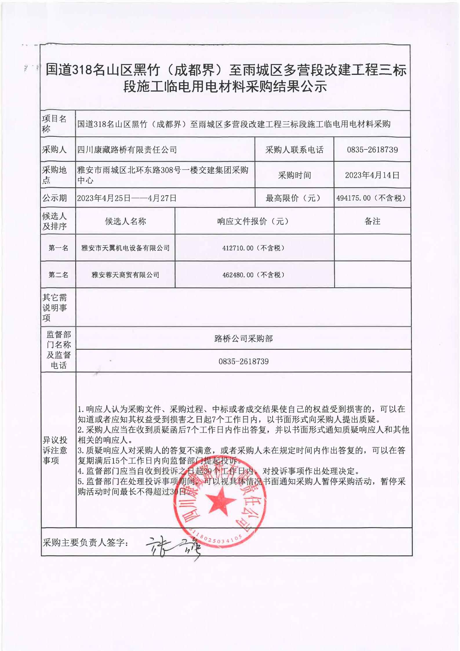 四川康藏路橋有限責(zé)任公司國道318名山區(qū)黑竹(成都界)至雨城區(qū)多營段改建工程三標段施工臨電用電材料采購結(jié)果公示