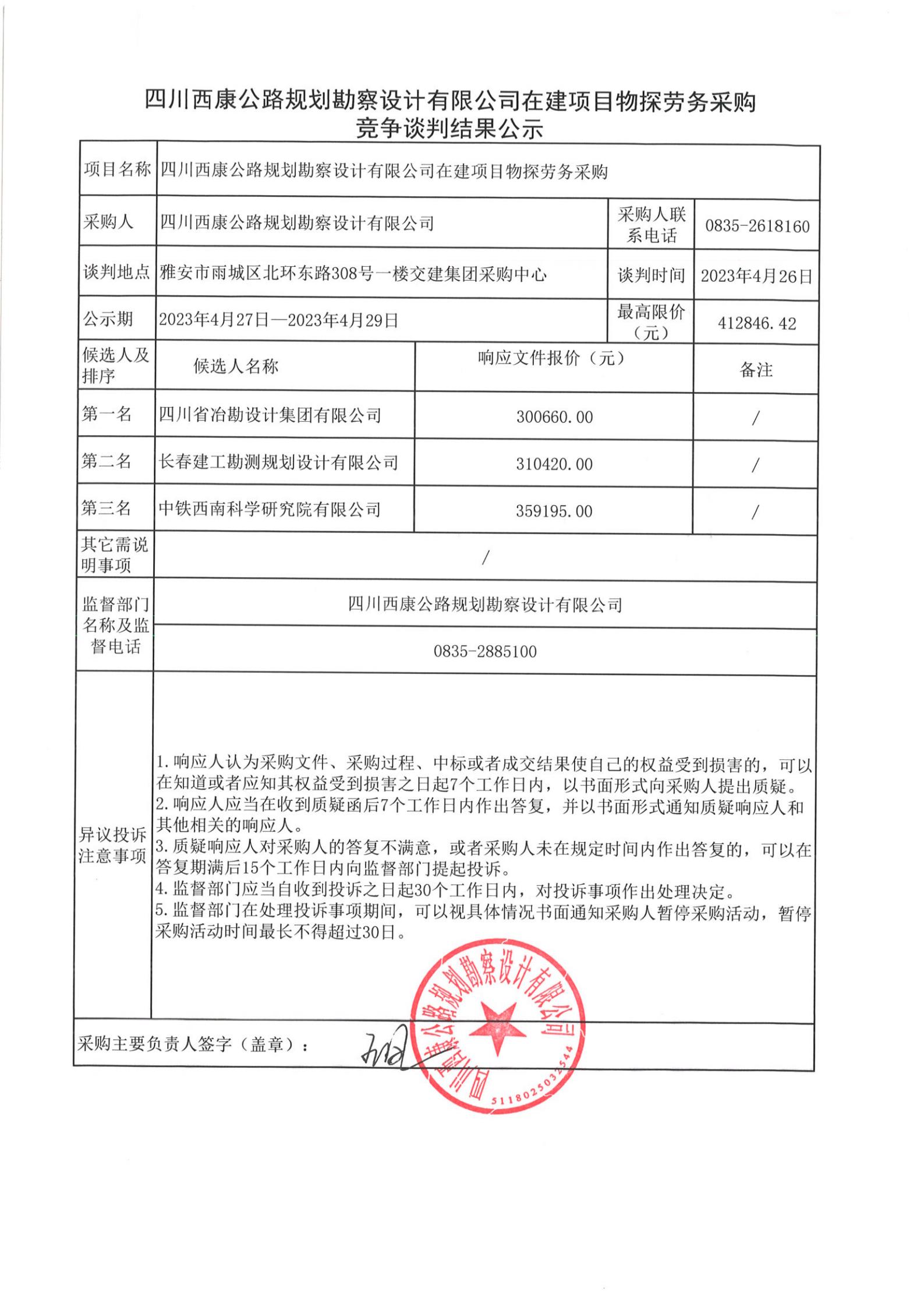 四川西康公路規(guī)劃勘察設計有限公司在建項目物探勞務采購競爭談判結果公示