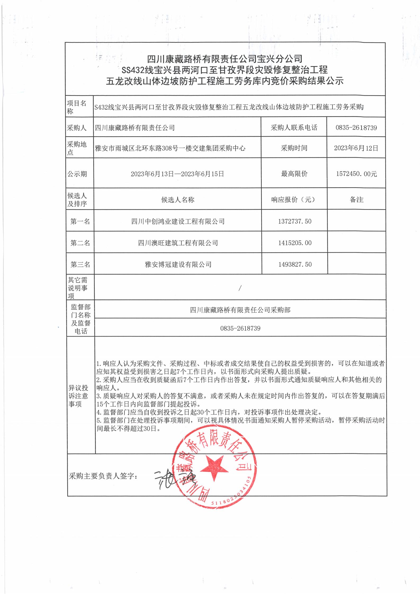 四川康藏路橋有限責(zé)任公司S432線寶興縣兩河口至甘孜界段災(zāi)毀修復(fù)整治工程五龍改線山體邊坡防護(hù)施工勞務(wù)庫內(nèi)競(jìng)價(jià)采購結(jié)果公示