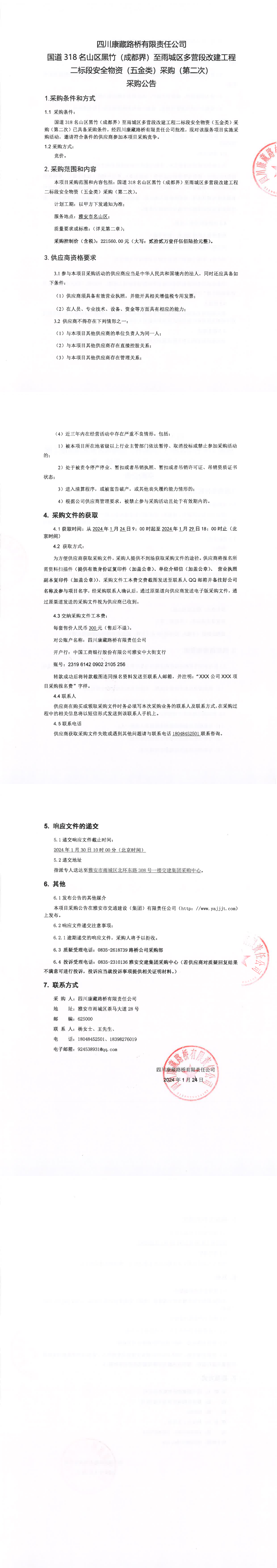 四川康藏路橋有限責任公司國道318名山區(qū)黑竹(成都界)至雨城區(qū)多營段改建工程二標段安全物資(五金類)采購(第二次)采購公告