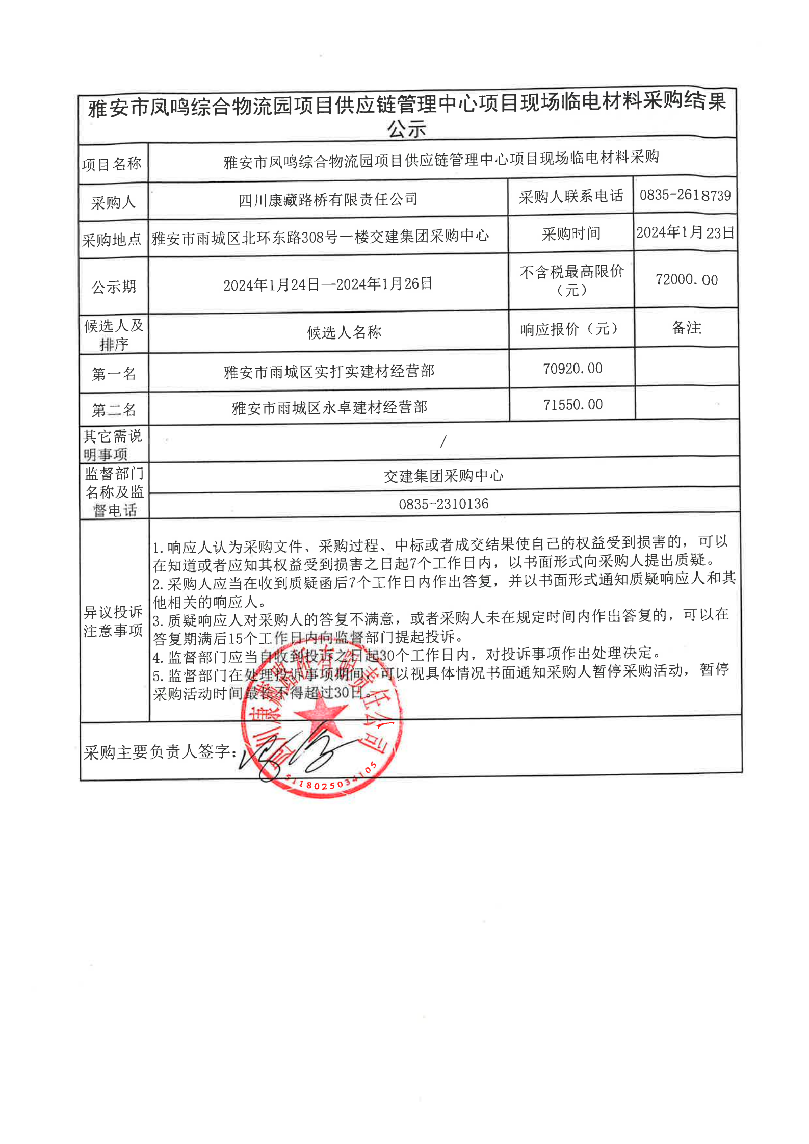 四川康藏路橋有限責任公司雅安市鳳鳴綜合物流園項目供應(yīng)鏈管理中心項目現(xiàn)場臨電材料采購結(jié)果公示