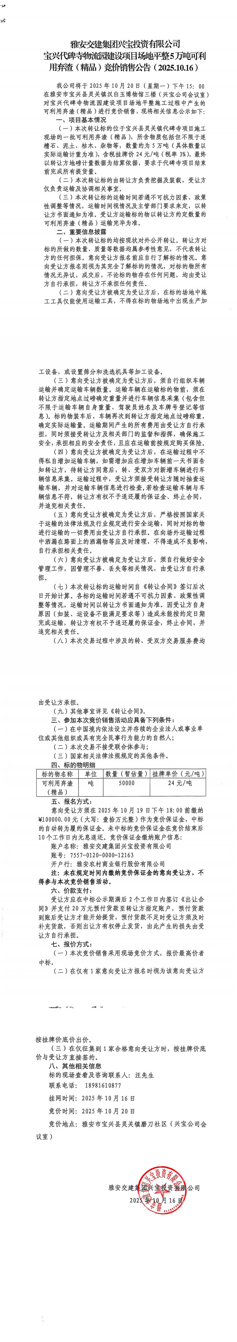 雅安交建集團(tuán)興寶投資有限公司寶興代碑寺物流園建設(shè)項(xiàng)目場(chǎng)地平整5萬噸可利用棄渣(精品)競(jìng)價(jià)銷售公告(2025.10.16)